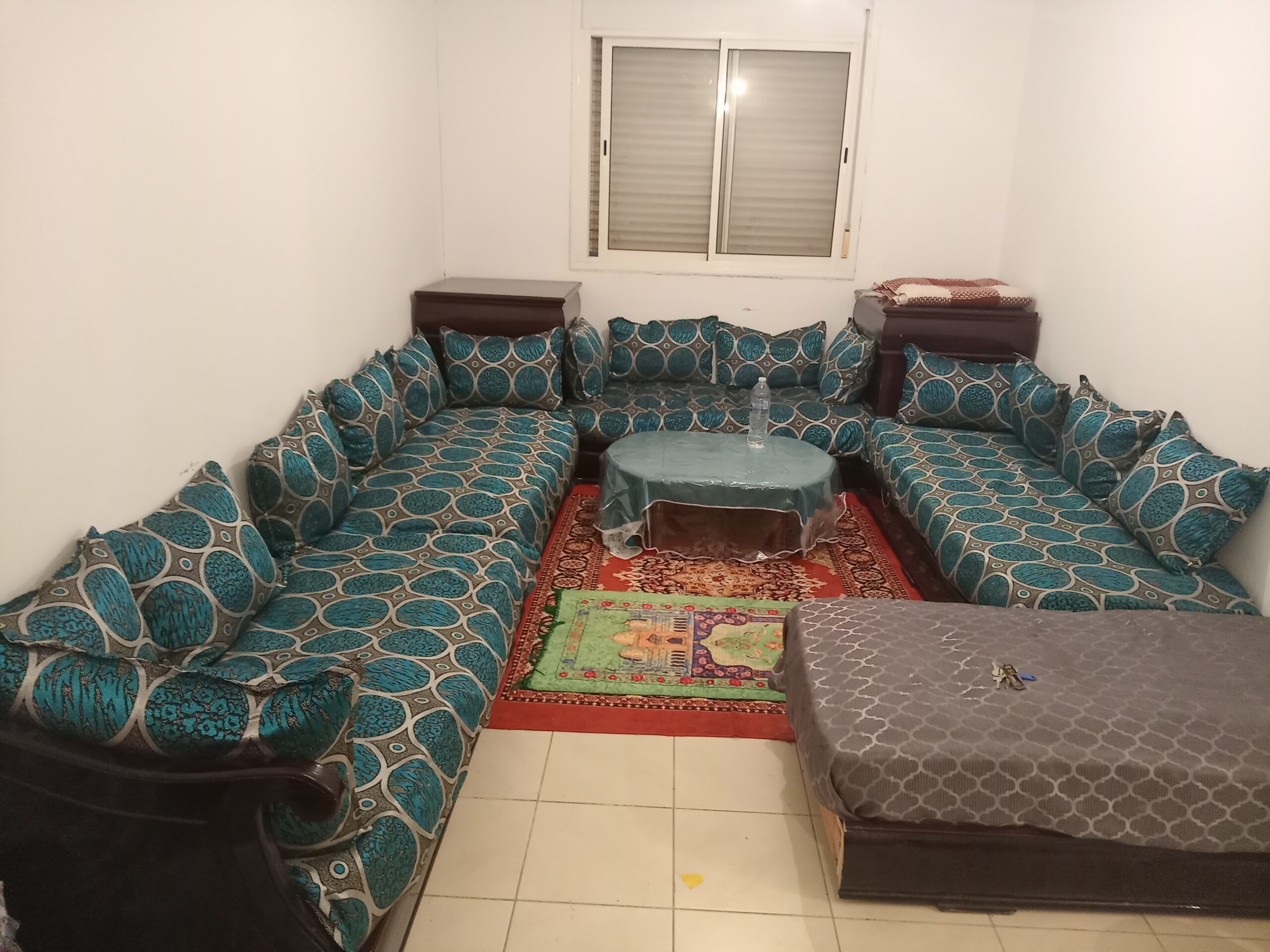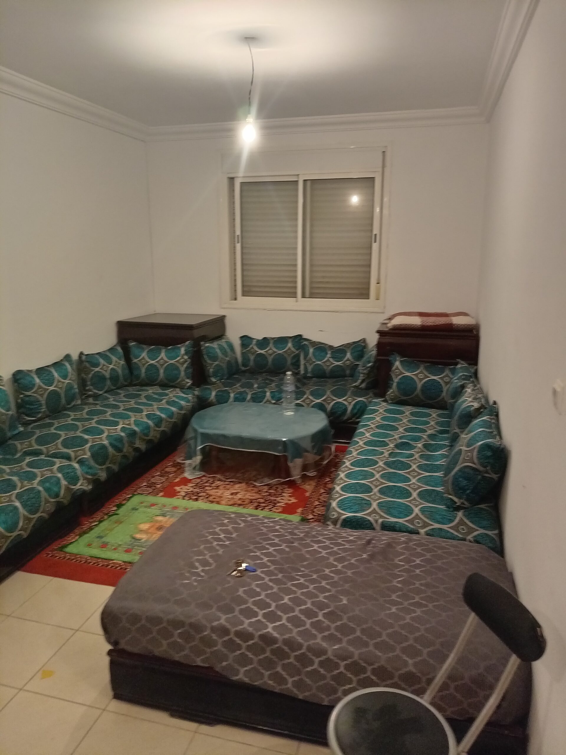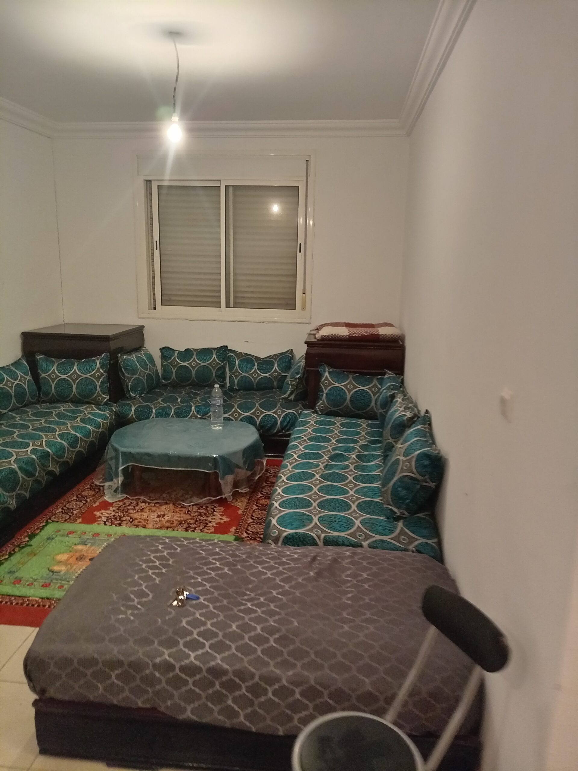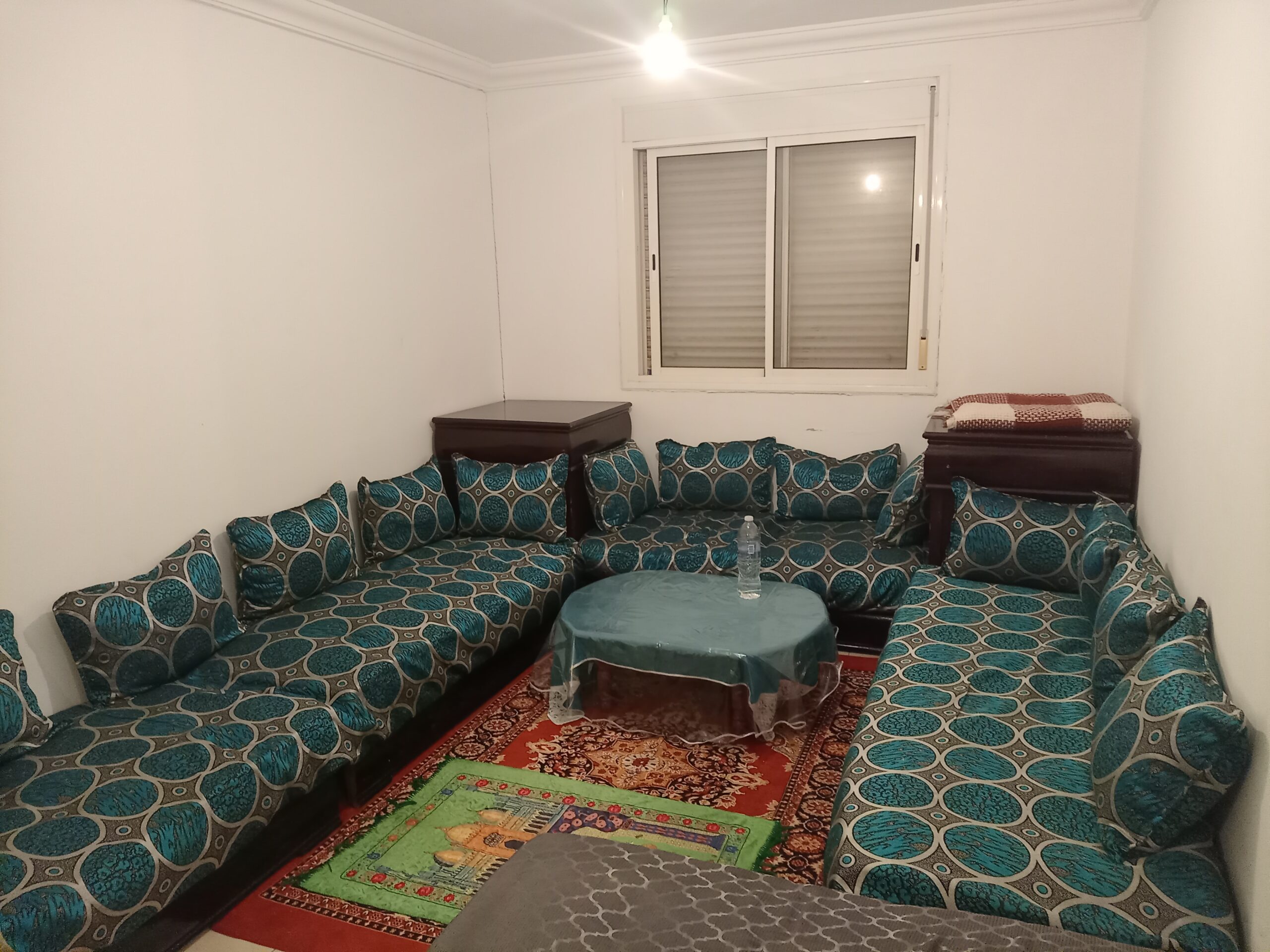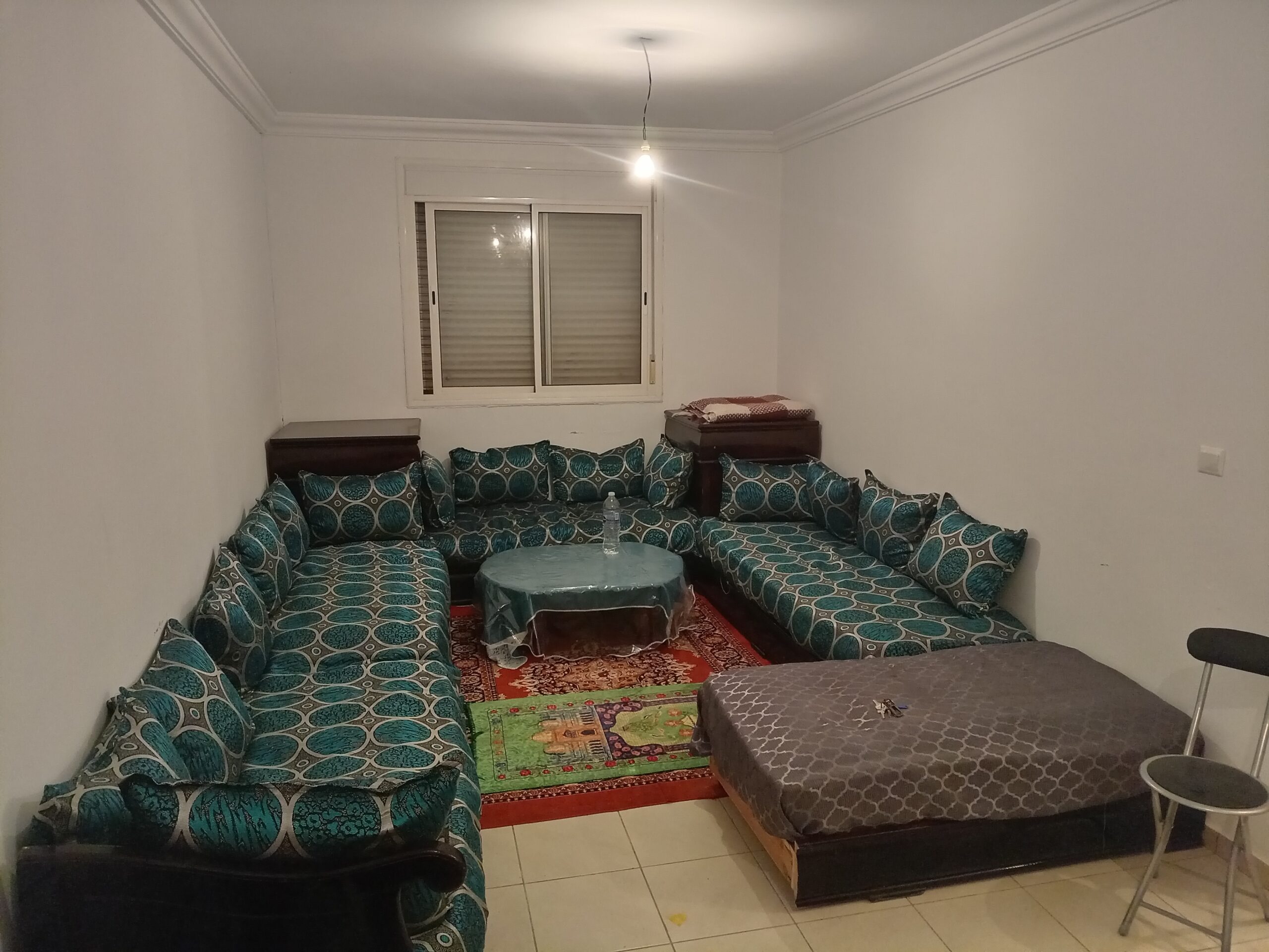 Un appartement à Riad Tanger de 50 m2 : un salon, 2 chambre, une salle de bain et une cuisine. Proche du : CHU Mohammed VI de Tanger, Forêt Diplomatique, Autoroute de Rabat, …