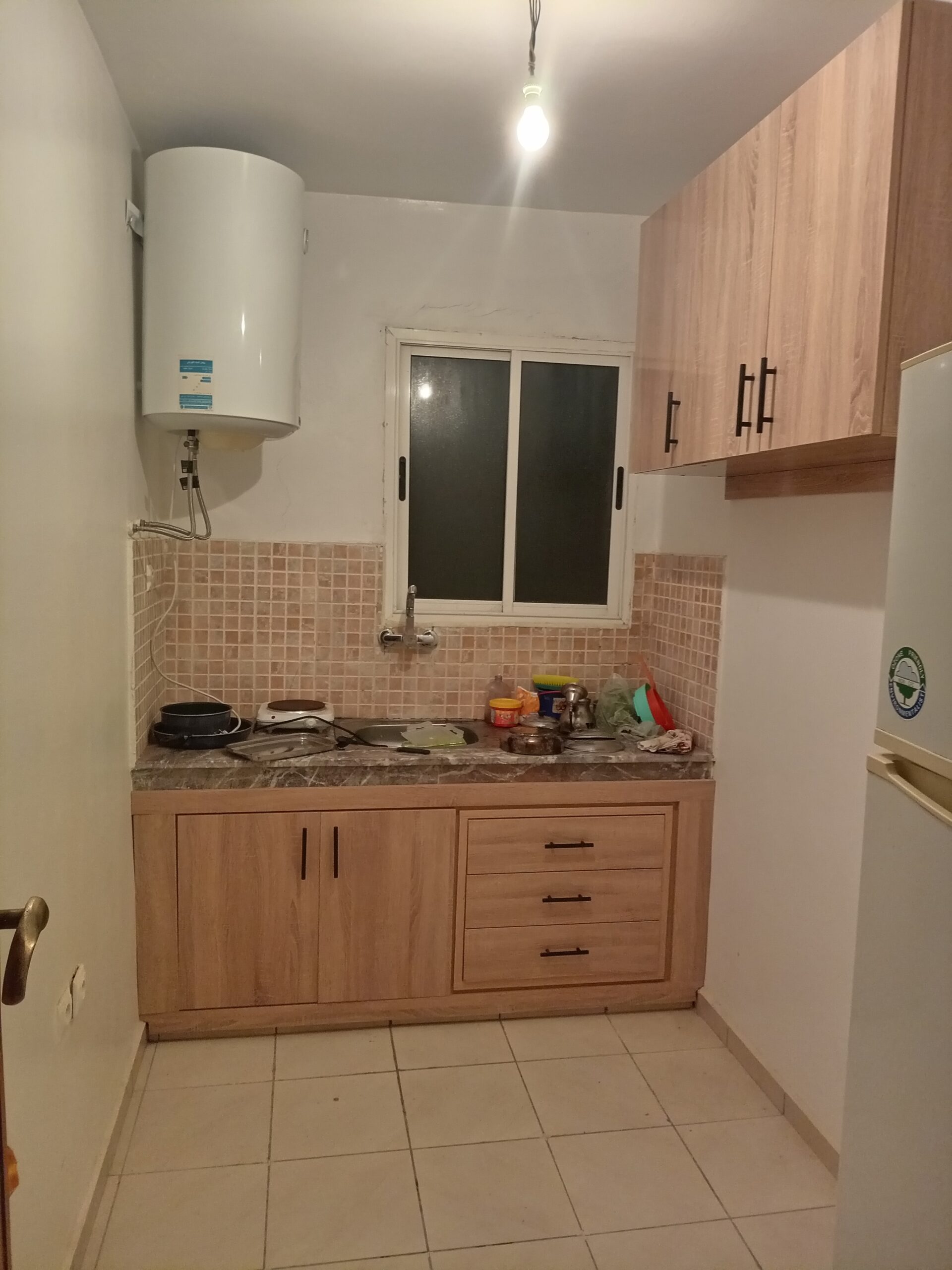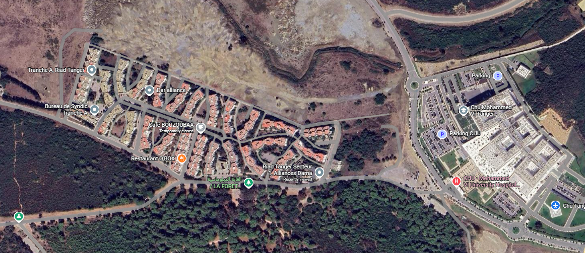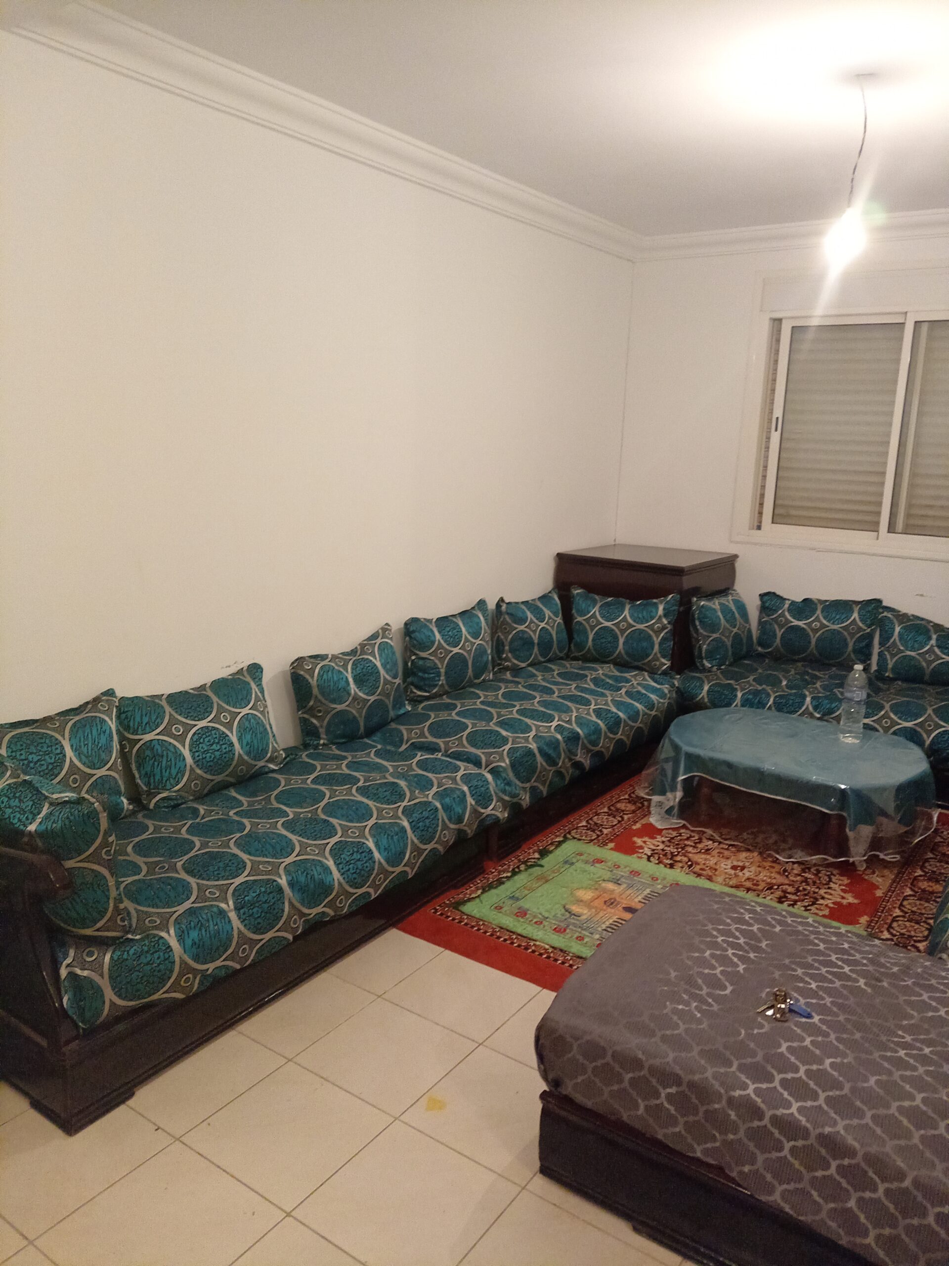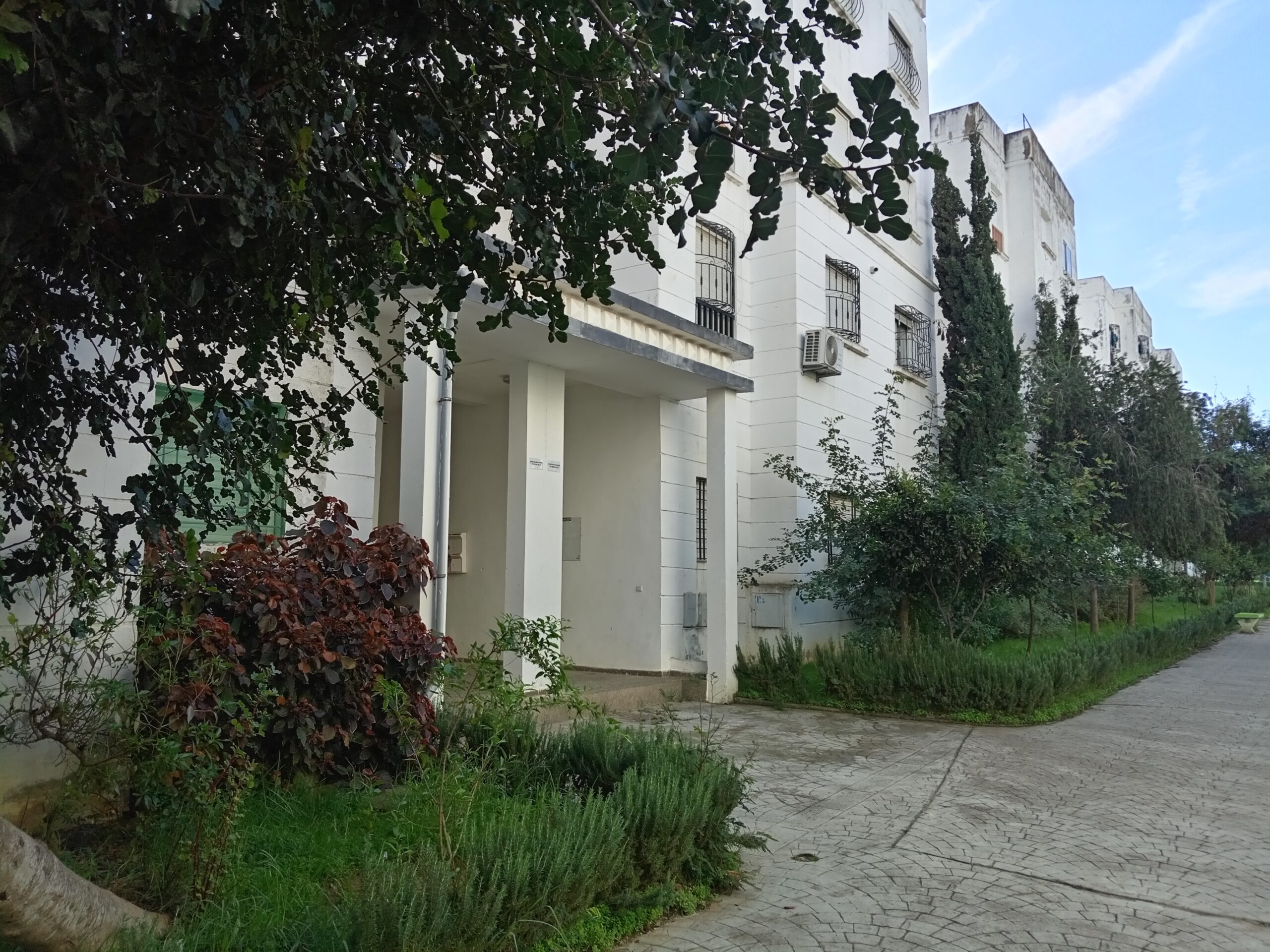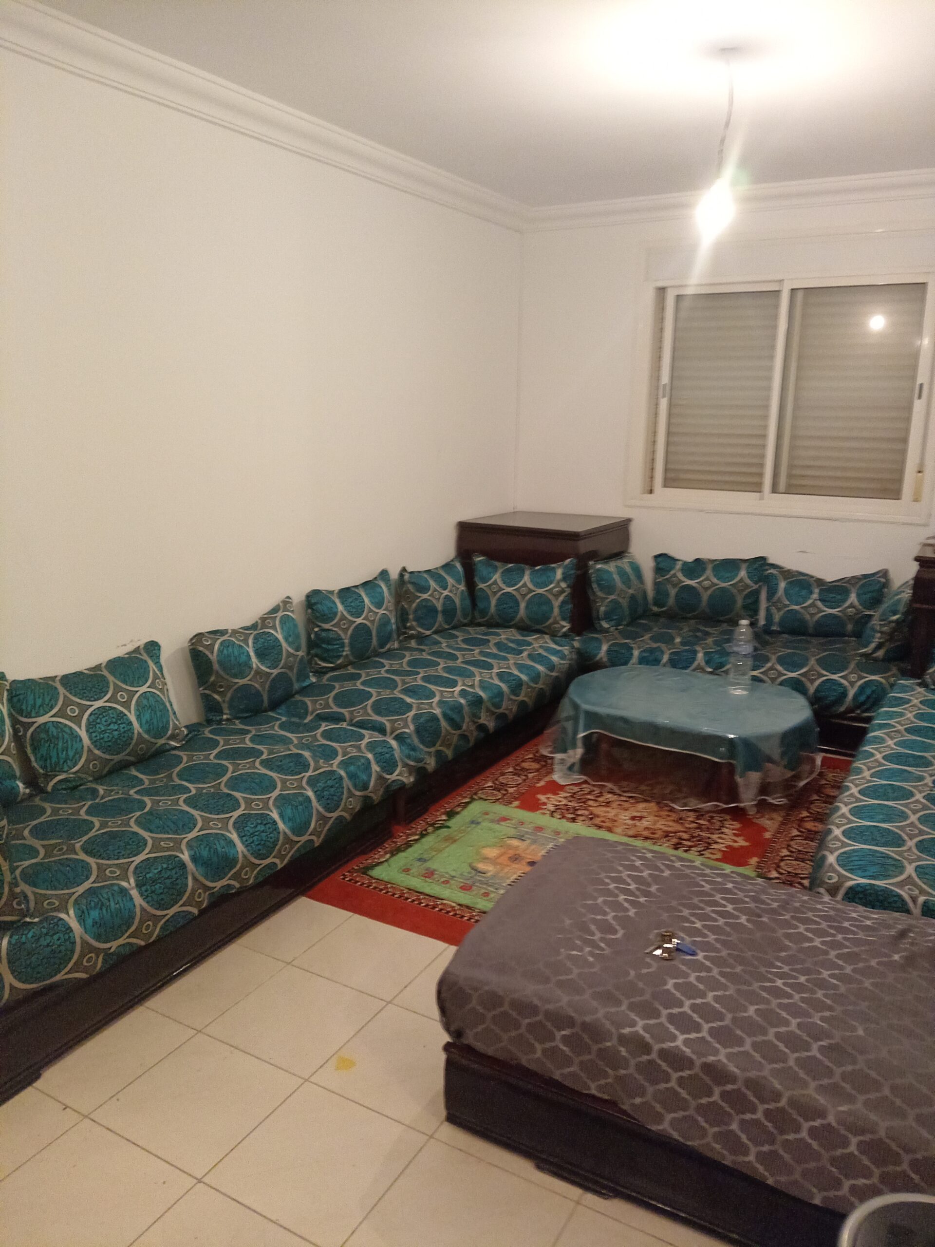 Un appartement à Riad Tanger de 50 m2 : un salon, 2 chambre, une salle de bain et une cuisine. Proche du : CHU Mohammed VI de Tanger, Forêt Diplomatique, Autoroute de Rabat, …